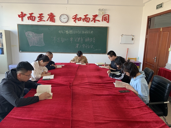 9月25日下午电气专业教师党支部书记刘微老师在图书馆541带领支部党员学习《习近平关于“不忘初心,牢记使命”论述摘编》1-22页内容。