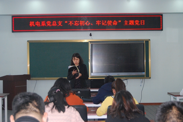 为引导党员深刻把握守初心,担使命,对照评估中的问题找差距、抓落实,10月22日,机电系党总支组织党员在图书馆608开展了“不忘初心、牢记使命”主题教育暨10月份主题党日活动。