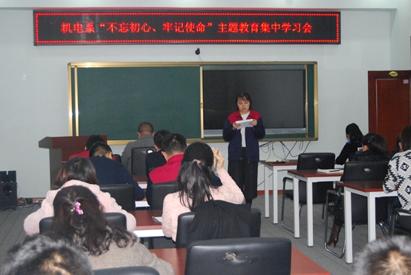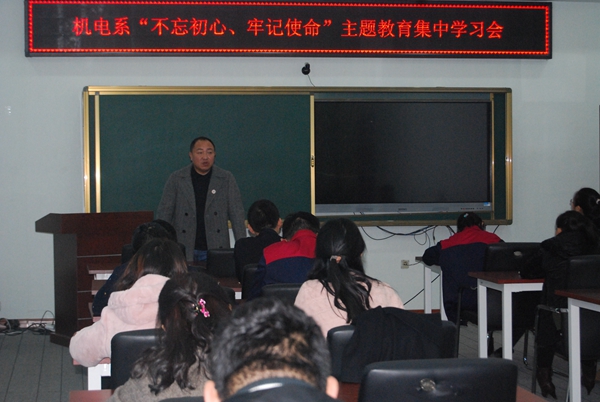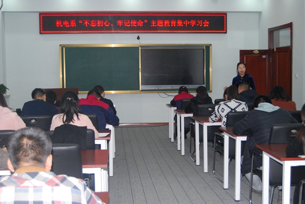 为扎实推进“不忘初心、牢记使命”主题教育,机电系11.12日下午在图书馆608召开“不忘初心、牢记使命”主题教育集中学习讨论会。党总支书记高爱利主持会议,机电系全体党员参加。