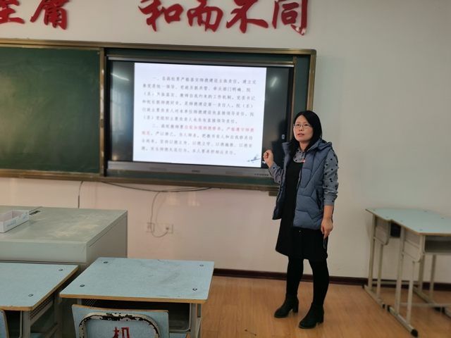 为加强师德师风建设,规范教师履职履责行为,落实立德树人根本任务,机电工程系党总支书记甄彩霞10月26日下午在图书馆429教室组织全体教工学习《教育部关于高校教师师德失范行为处理的指导意见》。