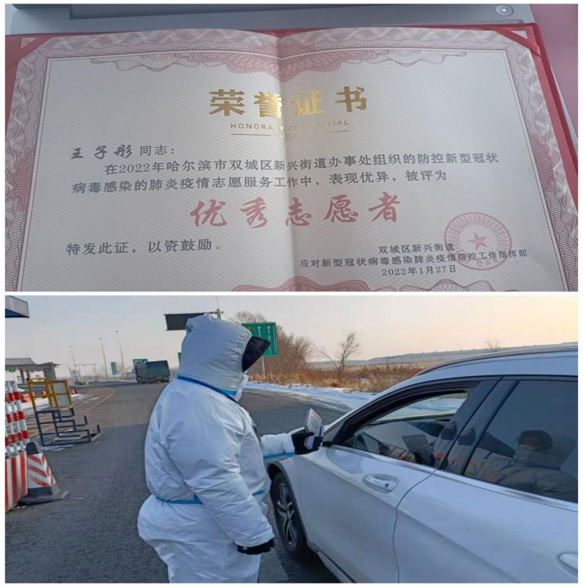 机械212班王子彤同学,在黑龙江省哈尔滨市双城区新兴街道高速路口,进行了疫情防控的相关工作,并获得了"优秀志愿者"称号。穿着防护服,查询过往车辆核酸、行程码、健康码,查询体温。王子彤表示:作为一名大学生,我深知自己的责任和义务,在保护自己的同时,尽我所能,做我力所能及之事,去帮助他人,因此,在疫情防控期间,为响应乡政府的号召,积极参与疫情防控活动。