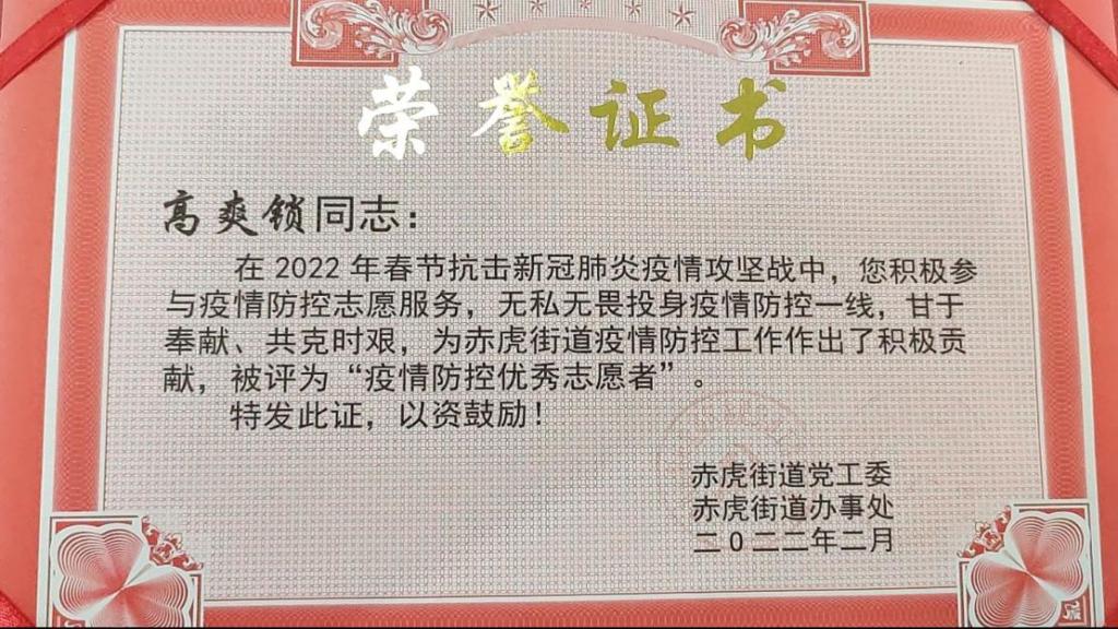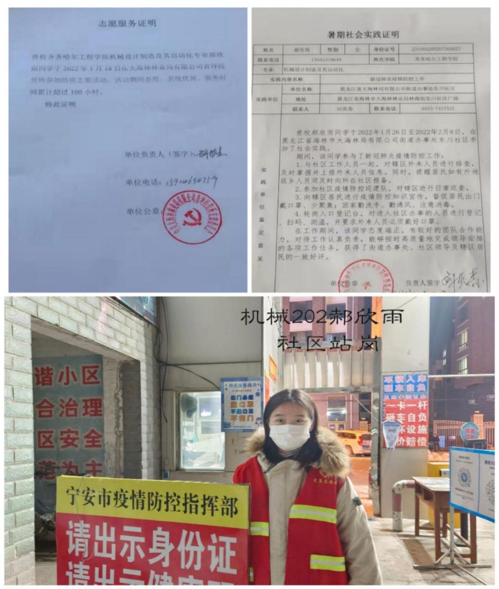 机械203班王旭同学,在假期中,为了开展学校第四学期中志愿服务活动,在黑龙江省伊春市嘉荫县青山乡双星社区参加了疫情防控志愿服务,在志愿过程中主要负责对排队做核酸时队伍秩序的管理,与帮助不懂得使用微信小程序的老人打开小程序。虽然经验不是很丰富,但是熟能生巧,在假期的志愿活动中慢慢锻炼,现在也成为了一个合格的志愿者,在假期结束前几天,也受到了来自双星社区的表彰,并颁发了荣誉证书,在做这种有意义事情的道路上,不会有尽头,同时作为齐工程学子,充分发扬了“为融入社会走进来,为服务社会走出去”的优良学风。