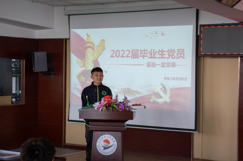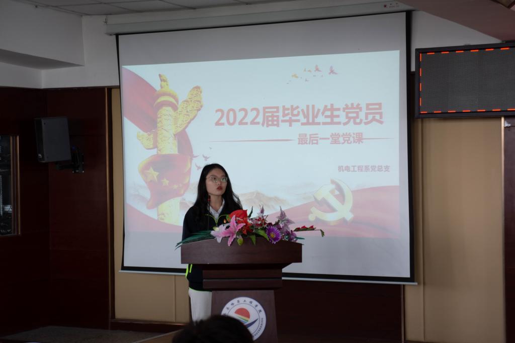 6月1日机电系党总支在图书馆501会议室开展以“端正入党动机,做合格党员”为主题的2022届毕业生党员“最后一堂党课”主题教育活动,本次活动是机电系毕业生文明离校工作的一项重要环节。党总支书记王丽萍为毕业生党员上在校期间的“最后一堂党课”,与毕业生党员重温入党誓词,激励毕业生党员牢记使命,不忘初心,带着母校美好的祝愿踏上人生新的征程,用热情和学识谱写青春绚丽篇章。