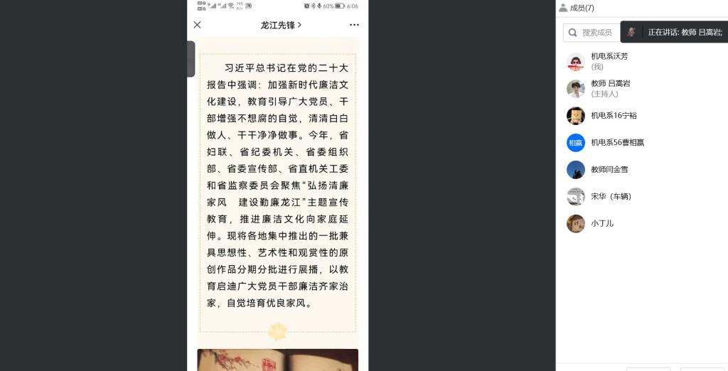 2022年12月22日晚18点车辆教师党支部书记宋华老师在腾讯会议平台上组织全体党员观看了“弘扬清廉家风 建设廉政龙江”主题宣传教育视频。
