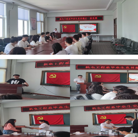 2023年6月2日上午在图书馆608会议室,机电工程系党总支为2023届毕业生党员进行了最后一堂党课。机电工程系党总支书记王丽萍老师、机械学生党支部书记李运强老师以及全体毕业生党员参加,本次党课由吕嵩岩老师主持。