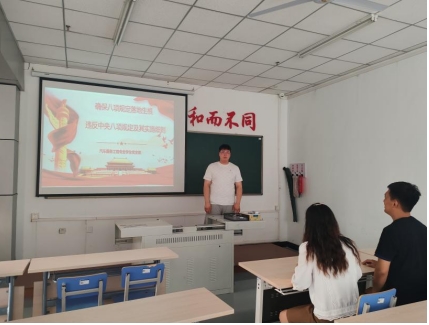 为深化作风建设,筑牢纪律防线,6月25日汽服学生党支部书记郭兴宇组织开展确保八项规定落地生根会议,支部委员参加,共同学习探讨。