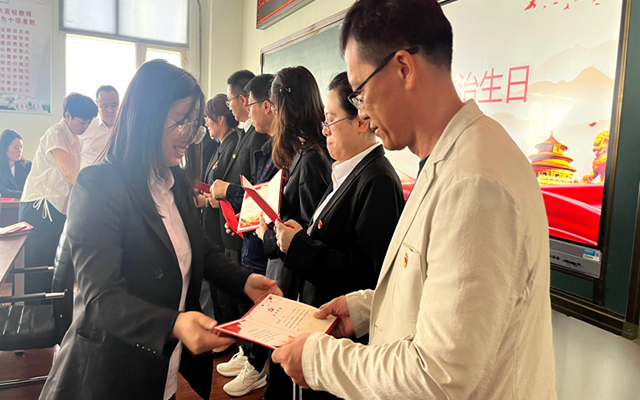 刘微与甄彩霞为过政治生日的党员们发放生日贺卡,贺卡附有政治生日寄语,既是对党员政治生命的见证,更承载着党组织对党员的深切勉励。