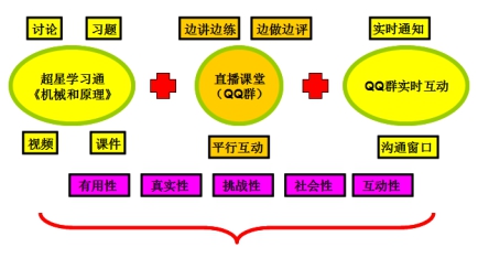 在线教学主要特色:“超星学习通+QQ群+直播课堂”混合式教学,利用积极学习类方法翻转课堂教学(边讲边练、边做边评、平行互动)。