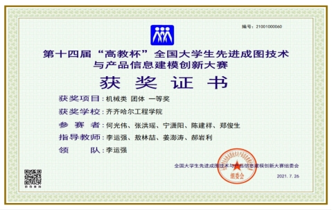 机电工程系成图工作室于2021年1月20日开始筹备第十四届“高教杯”全国大学生先进成图技术与产品信息建模创新大赛,本届机电系成图工作室指导教师团队由机电系机械专业负责人敖林喆、机械专业教师郝岩利、姜澎涛和机械制图教研室负责人李运强4名老师组成。成图工作室参赛团队继2020年获得全国二等奖和2021年5月份获得全省一等奖后,毫不松懈,不骄不躁,继续提升训练强度,终于于2021年7月实现了摘得全国一等奖的目标,获得了历史最好的成绩。
