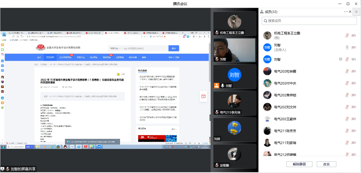 2022年黑龙江省大学生电子设计竞赛(TI杯)即将开赛,电气专业共18支队伍报名参赛,为了更好的服务学生,让学生更加深入的了解竞赛各项要求,2022年10月6日下午,电气专业组织师生召开了赛前准备会,本次会议以腾讯会议的形式进行,刘智老师主持会议。