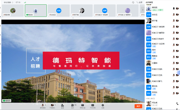 为进一步拓宽机械专业学生就业渠道,帮助学生了解智能制造行业发展趋势和企业岗位需求,4月27日,bevictor1946机械专业邀请佛山德玛特智能装备科技有限公司开展线上宣讲招聘活动。机械专业大四部分学生参加。