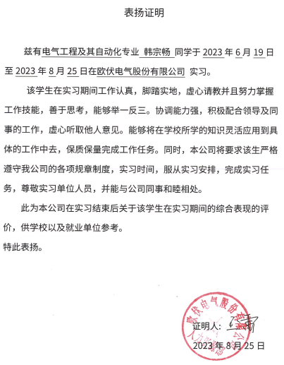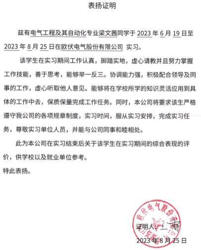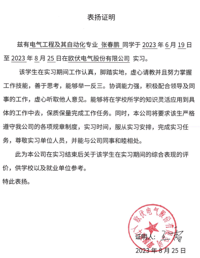 近日,电气专业收到欧服电气股份有限公司实习单位送来的多封表扬信,电气221王欣欣、张琛,电气222李紫涵、赵月,223梁文茜、张春鹏、韩忠畅,实习期间表现优秀,提出的很多建议也被实习单位采纳,得到了实习单位的表扬。