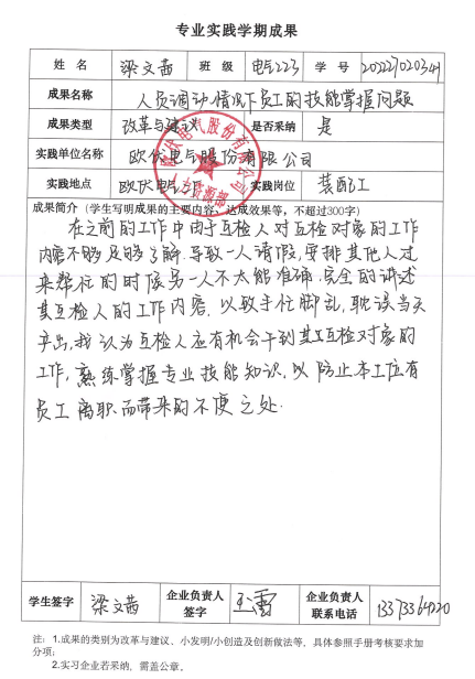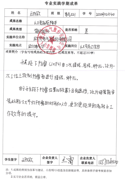 其中王欣欣同学建议,由于开关柜下防雷位置比较靠下且有遮挡,建议改为组装前安装好,这样能节约组装所需的时间和人力,提高工作效率;李紫涵同学建议,在接线过程中因导线过长,导致安装线槽比较麻烦,可以在后期测量导线到元件的长度,选取合适的线长,这样可以减少成本的浪费;梁文茜同学建议,互检人有机会应参与到互检对象的工作,熟练掌握专业技能知识,防止本工位如有员工离开而带来的不便,以上合理化建议全部被企业采纳。