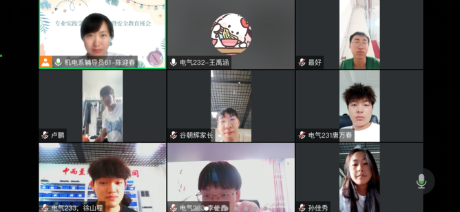 为了增强学生在专业实践学期的安全意识,提高自我保护能力,确保实践活动的顺利进行,电气22、23级于7月23在线上举行了专业实践学期安常规常识暨安全教育主题班会。本次班会由辅导员老师陈迎春主持,全体同学参加。