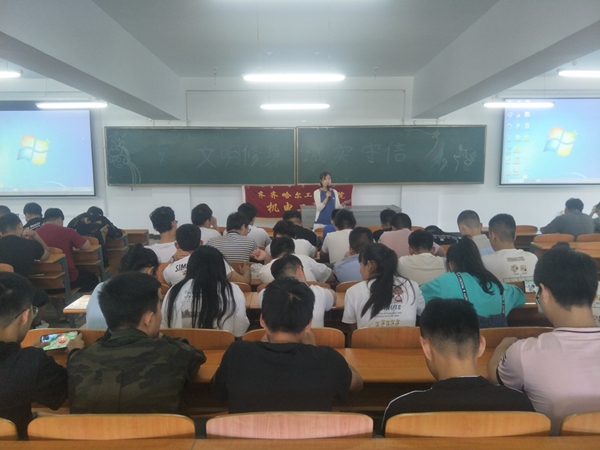 9月1日,辅导员王虹老师在图书馆101组织17、18级全体机械专业的学生召开“文明修身,诚实守信”大班会,旨在加强学生的诚信意识,督促学生做好补考准备,杜绝作弊行为。并传达学校新学期相关要求,要求学生在新的一学期要有新的面貌、新的目标、新的作为。