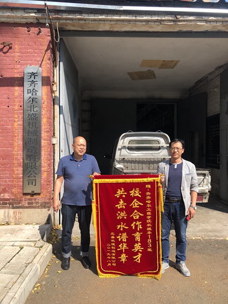 9月5日北盛机械制造有限公司副总经理姜宝君为机电系送锦旗,“校企合作育英才、共击洪水谱华章”,表彰机电系机械183班学生在2019年第三学期实习工作中为企业做出的突出贡献。