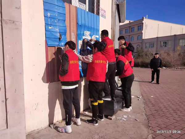 在齐齐哈尔南站领导的安排下,同学们来到南站附近的社区清理墙上的小广告。这种小广告最难清理,刚开始同学们都不会弄,手忙脚乱,并且效果还不好。后来同学们找到了窍门,利用自己手中的工具将墙上的小广告一一打扫干净,天气很冷,但是同学们干得热火朝天。经过一上午的劳动,同学们将墙上的小广告都清理干净。
