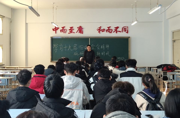 首先团支书带领班级同学共同歌唱共青团团歌;随后,组织委员为大家播放《十九届四中全会》视频;视频结束后,团支书说:作为一名新时代青年,要认真学习贯彻落实全会精神,坚定制度自信,不断推进国家治理体系和治理能力现代化,要沿着党和人民开辟的正确道路,保持定力,开拓创新,要为中国实现“两个一百年”奋斗目标和中华民族伟大复兴中国梦奋力前行。最后,班级的同学纷纷上台分享自己的心得体会,本次活动在同学们的讨论声中结束。