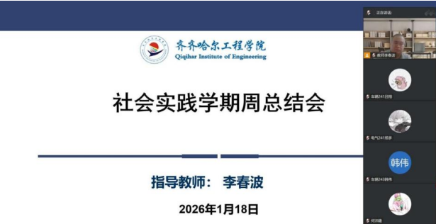 为深入贯彻落实学校《2025-2026学年度社会实践学期实施方案》,提升学生专业核心能力与社会适应能力,1月18日,李春波老师在线上召开了社会实践学期周总结会。本次会议旨在通过复盘前期进展、明确后续任务、强化督促指导,确保每位学子都能在社会实践中有所收获、有所成长。