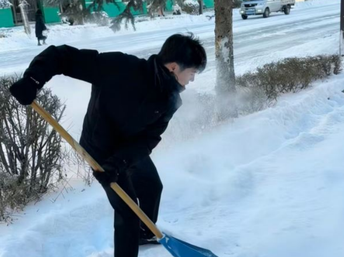 志愿者们手持铁锹,扫帚分工协作,有的用铁锹破除冰面薄冰,有的用扫帚清扫零散积雪。我负责将成堆积雪搬运至绿化带旁。大家相互鼓励,默契配合,不顾双手冻红,额头冒汗,经过三小时的奋战,成功清理多条关键通行道路,为村民出行扫清障碍。