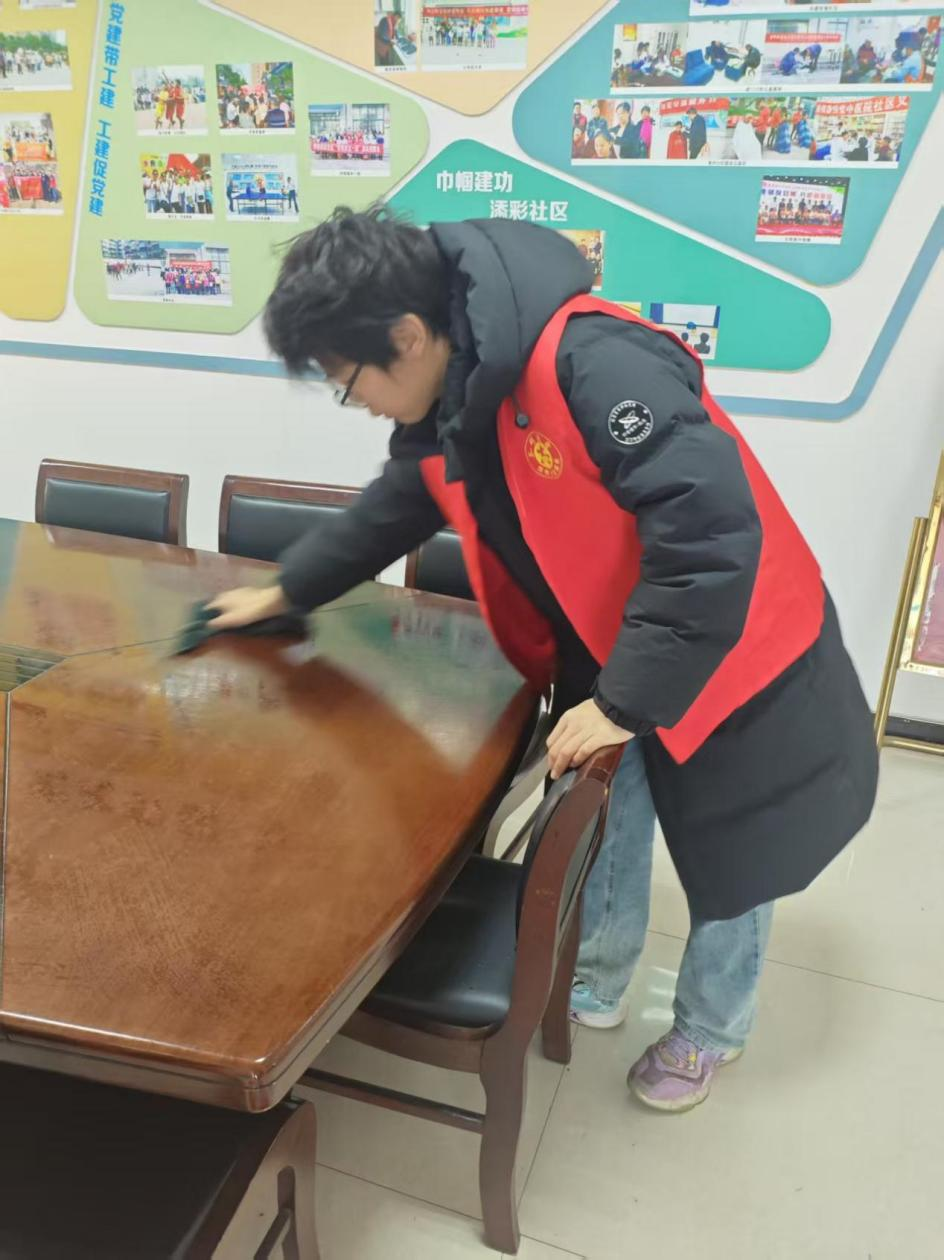 段嘉虎于滨彩社区党群服务中心参与了活动室环境整理工作。活动室内墙面上,“党建带工建 工建促党建”“巾帼建功 滨彩社区”等主题展板记录着社区过往的活动。段嘉虎身穿红马甲,对活动室的长桌进行了细致擦拭,确保桌面干净整洁,为后续居民开展各类活动营造了舒适的空间这一看似微小的举动,让他切实体会到“志愿精神”不在于宏大叙事,而在于日常点滴的付出。通过参与这类基础服务,他不仅为社区居民提供了切实的便利,也更深刻地理解了基层服务的价值,以及个人行动在构建和谐社区中的作用。