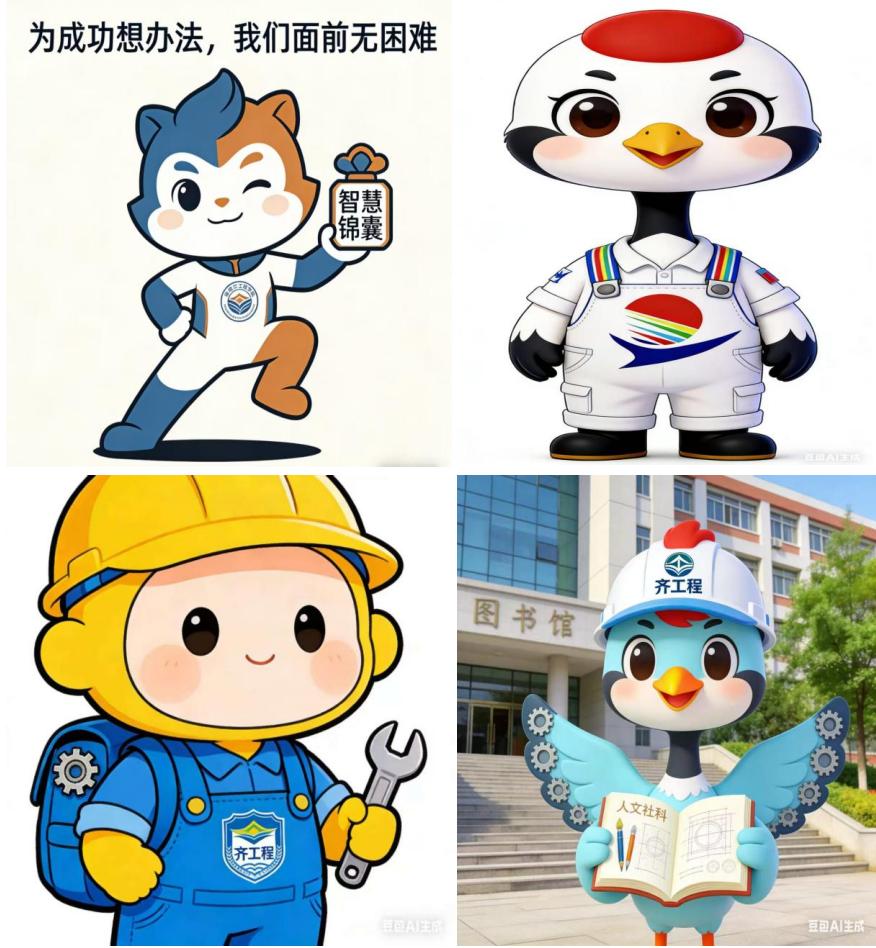 在项目指导下,每位成员首先阅读人文社科与设计类相关书籍,深入理解校园精神内核,并借助AI辅助工具进行创意设计。冯小宇的作品聚焦奋进主题,以昂扬向上的造型传递突破困境的决心;徐伟的设计强调担当理念,通过协作姿态体现团队精神;张文豪的创作融入智慧元素,结合锦囊意象表达谋事在前的思维;周鑫渭的方案则突出协作内涵,以联结互动的形象诠释集体力量。