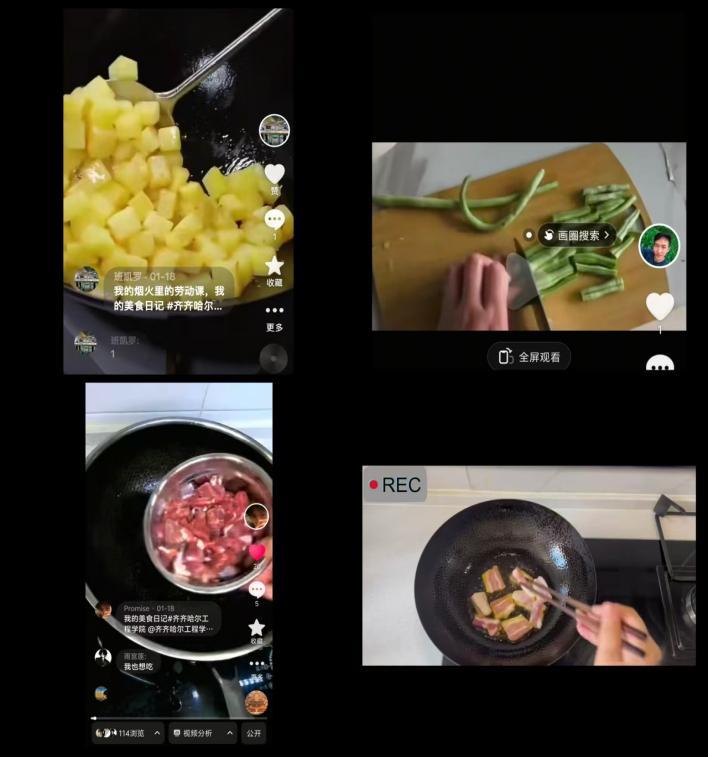 临近过年,小组成员们分别在自己家里帮助家人,准备食材拿起厨具投入烹饪劳动中。同学们有的从劳动中学会熟练切菜,有的学会煎炸烹炒,既展现了自己的厨艺,又帮助减轻负担,让家人感到骄傲。一刀一铲之间,原本简单的食材被做成可口的佳肴,为长辈亲人端上了一桌暖胃又暖心的家常饭菜。
