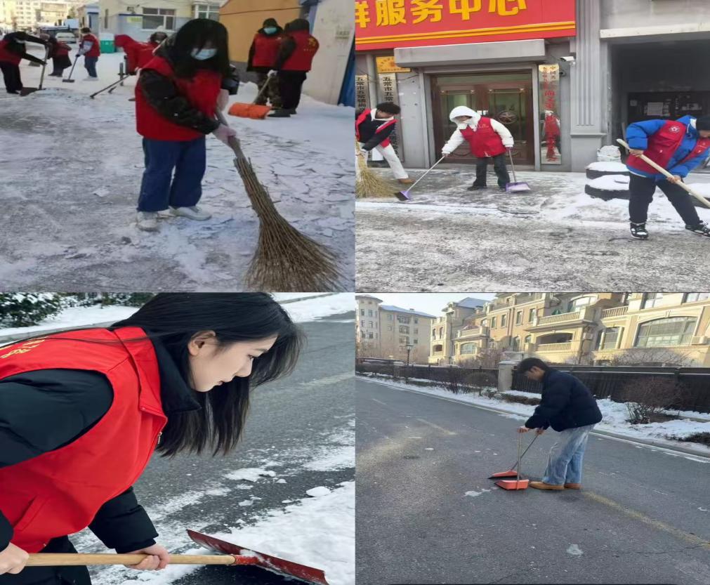 为营造安全整洁的出行环境,jx2026039小组于2026年2月21日组织开展扫雪除冰志愿服务活动。吕喆、支兴雯、付橘鑫、韩景旭四名同学主动参与,不畏严寒、分工协作,用实际行动为大家清扫出一条安全畅通的道路。