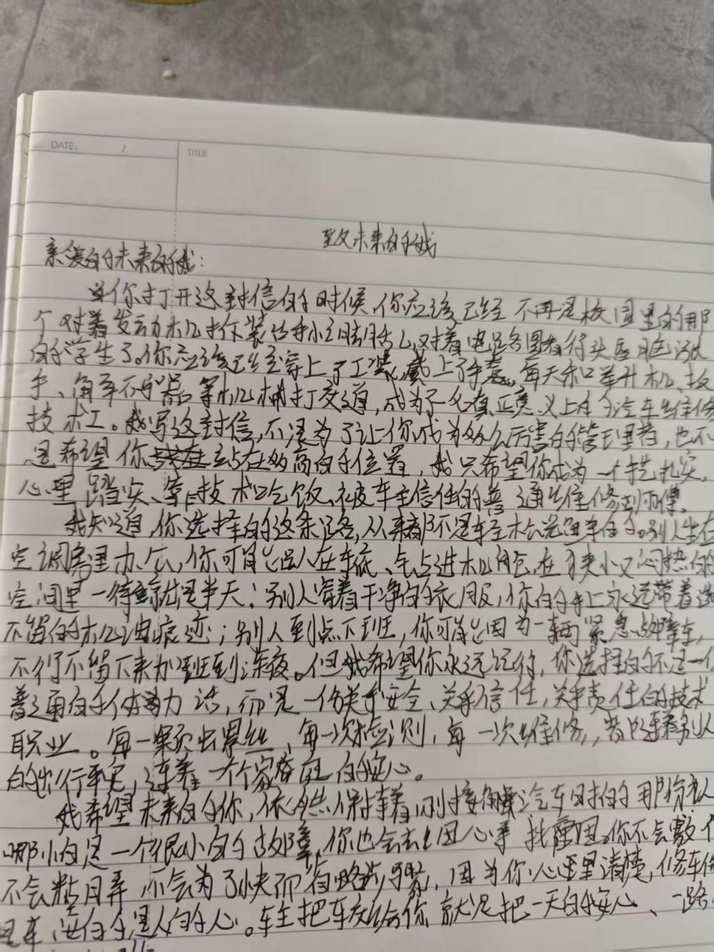 活动中,小组成员们以汽车服务工程专业学子的视角,与未来即将成为汽车维修技师的自己展开对话,清晰勾勒出汽修技师的职业日常,从俯身车底的忙碌到手握扳手的坚守,从机油浸染的双手到精准检测的专注,真实还原了基层技术工作者的工作场景,更道出了汽修行业关乎安全、承载信任的职业内核。书信创作过程中,学生们将专业素养与职业精神深度融合,既明确了从燃油车机械维修到新能源汽车电控、电池检修的专业学习方向,更立下了“手艺扎实、做事认真、待人真诚、守住良心”的职业准则;既正视了职业路上的辛苦与挑战,更坚定了靠技术立身、以诚信待人的初心,字里行间传递出“手上有活,心里有光”的职业追求,以及对平凡岗位不凡坚守的深刻理解。