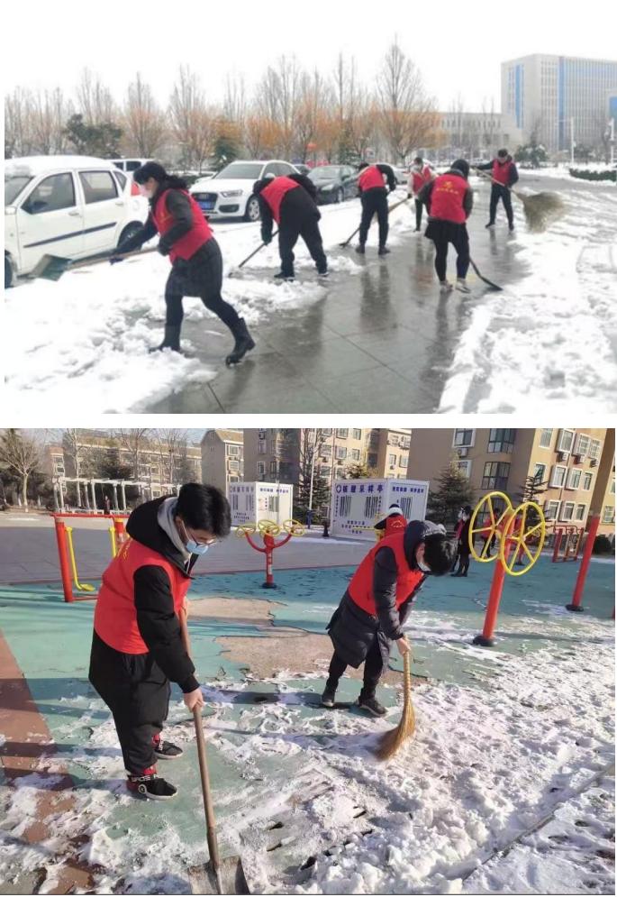 活动中,小队成员分工协作、干劲十足,手持铁锹、扫帚、雪推板等工具,对社区主干道、居民楼出入口、人行道等区域的积雪和积冰进行全面清理。大家不畏严寒、相互配合,有的奋力推雪铲冰,有的仔细清扫路面,有的将积雪搬运至指定区域,经过数小时的奋战,原本积雪覆盖的街道被清理得干净整洁,为社区居民打造了安全、通畅的出行环境。同时,队员们还对街道两侧的垃圾、落叶进行了全面清扫,清理卫生死角,让社区环境焕然一新。