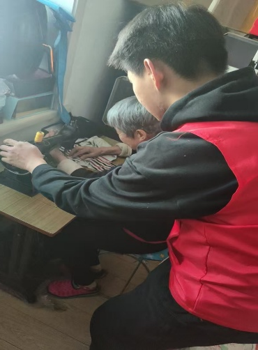 杨镇同学与社区工作人员前往社区独居老人家中,不仅帮助老人调试家电、整理生活物品,,还耐心陪伴老人学习使用缝纫机等日常工具,用细致的关怀温暖了老人的心。