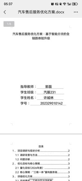 在汽车服务工程领域,许城林,卢毅同学立足行业实际,围绕汽车全生命周期服务场景展开深入调研,针对性设计服务优化方案。从市场需求分析、客户分流机制规划,到服务流程简化、推广活动创意构思,每一项成果都注重可行性与实用性。同时,两位同学精心制作服务流程演示视频或优化方案流程图,以直观形式呈现实践成果,兼具专业性与传播力。