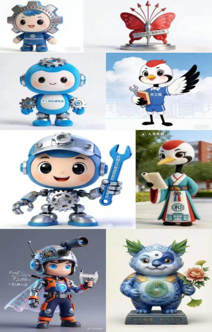 活动中,党雪静深挖校史与文化资料,将校徽丹顶鹤、校训精神与工科特色融入设计,打磨出多套特色方案;户国朝结合AI工具打造“齐小鹤”“齐小匠”,塑造高辨识度文化符号;黄思源巧用AI设计“梦庸蝶”“械小轮”,实现专业知识与创新思维的跨界融合。机械242班安兴威也参与其中,独立构思出“机甲小博士”与“中和瑞兽”两款吉祥物,前者科技感十足,象征科学探索精神,后者承载传统文化,倡导和谐共生理念,二者一科技一传统,呼应仰望星空、脚踏实地的态度。
