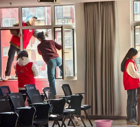 在志愿活动中,闫宏一和于海男身穿红色马甲,红色马甲穿梭忙碌,同学们分工协作、干劲十足。大家拿起清洁工具,认真擦拭玻璃、清扫地面、整理房间、清洁角落,将福利院的各个区域打扫得窗明几净、整洁有序,用细致的劳动为老人们营造了舒适舒心的居住环境。