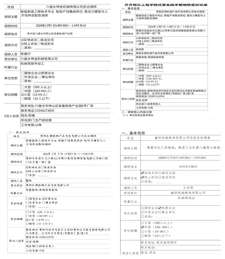 活动中,成员们分工协作,深入三家企业一线开展调研。王成缤聚焦“机械制造行业岗位实况”,拍摄了走访鑫恒机械制造有限公司的纪实视频,镜头里详细记录机械制造车间生产流程、核心岗位工作内容,配文“走进企业车间,解码专业就业密码”。陈建行化身“一线探访员”,推出“智能制造车间系列,展现六盘水坤金机械有限公司自动化产线运作场景,从工业机器人调试到零部件加工全流程记录,结尾附上“理论联系实际,调研助力成长”的感悟。张铂昆、与黎艳则开启“企业访谈干货分享”,通过与贵阳志源机械产品开发有限公司财务负责人的访谈重点,用3分钟解读机器人专业人才需求标准与职业发展路径,搭配“调研促认知,实践明方向”的标签,吸引同专业学生关注。