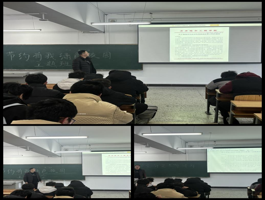 活动伊始,徐飞老师围绕学校文件要求,向全体学生传达了本次反对资源浪费工作的核心要求与重要意义,从食品浪费、水电浪费两大校园突出问题切入,结合校园实际案例,讲解了就餐、外卖、零食采购中的节粮技巧,以及寝室、教学楼的节电节水方法,引导学生深刻理解“谁知盘中餐,粒粒皆辛苦”的内涵,树立“惜水节电,人人有责”的责任意识,号召全体学生从自身做起,杜绝各类资源浪费行为,形成思想和行动上的双重自觉。随后,徐飞老师对学院落实学校系列主题活动的具体安排进行部署,明确各项活动的时间节点与参与要求。针对“节约有我,绿色校园”主题班会,要求各班级以观看公益短片、分享节约故事、开展浪费现象大讨论等形式,凝聚节约共识;鼓励学生积极参与学校“光盘+节能”线上打卡活动,将光盘就餐、随手关水关灯的日常行为转化为打卡行动,积累第二课堂积分,争当“节约标兵”。同时,徐飞老师动员学生踊跃报名学院志愿者队伍,积极参与学校“节粮护粮·节水节电”实践体验活动,在食堂餐具回收、校园水电设施检查等实践劳动中,近距离感受劳动价值,感悟资源来之不易,将节约理念转化为实际行动。