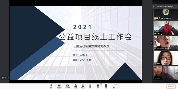 会议开始,组员们积极配合,寻找可行的实施办法,运用灵活的思维去思考备用公益方案的开展,通过本次线上会议,大家明确了备用方案的实施办法,组员的各自分工,以及以后的材料分析总结,明确了,学校开展第四学期的意义,让我们更好的为融入社会走进来,为服务社会走出去的理念。
