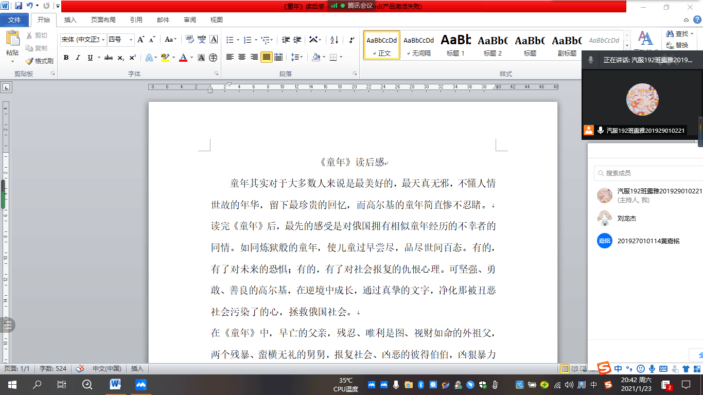 2021年1月18日-24日,我们小组CY-067在第二周在腾讯会议进行了线上读书交流活动。我们组长是汽服192班露雅,组员有汽服191王骞皞,汽服191刘龙杰,机械本191黄嘉铭。本周我们小组除了在线上继续进行创业实践活动,还利用空余的时间去精读我们所借阅的书籍并在读书交流活动中抒发自己的感想。让我们的成员更深刻了解读书的意义。