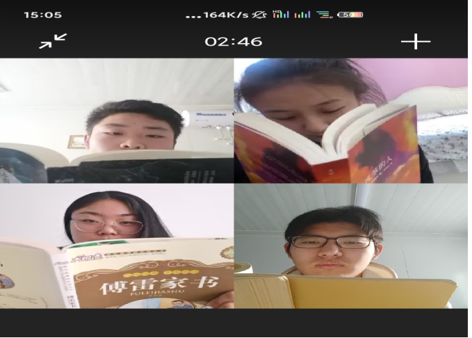 为了响应学院的号召,积极踊跃的参与第四学期实践活动,GY—103组杨宏宇,高金海,马晓雨,周华静于2021年1月16日运用微信视频开展了线上读书交流活动。