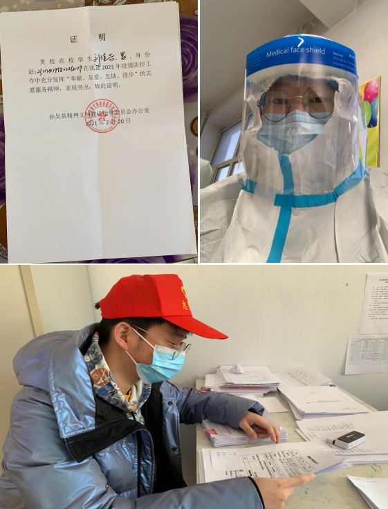 机电工程系机械本183班刘佳兴同学家住黑龙江省黑河市孙吴县。在寒假期间,他积极申请做当地“全县人民做核酸”活动中的志愿者。1月28日,以出色的志愿服务工作被县表扬为优秀志愿者。