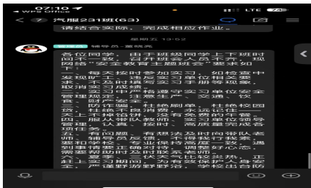 为了确保汽服231学生在岗实习期间的安全,切实提高学生的安全意识,守牢安全底线,汽服231班开展了安全教育的线上主题班会。本次会议由辅导员董晓亮老师主持、全体学生参加了主题班会。