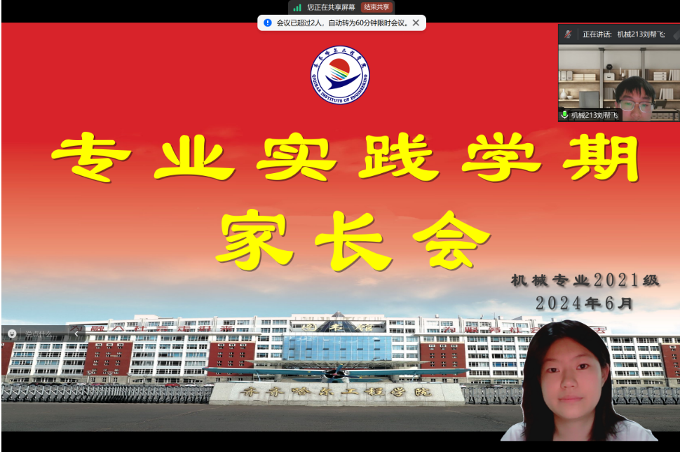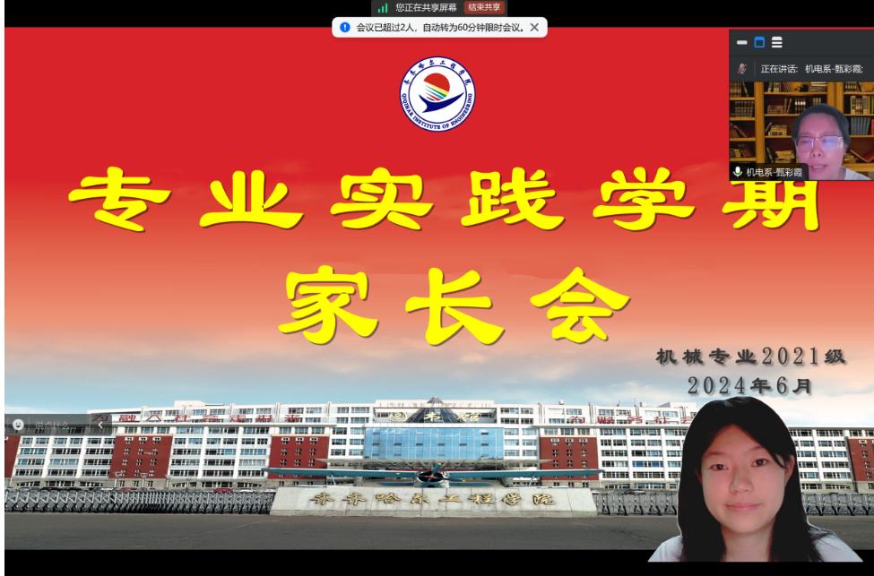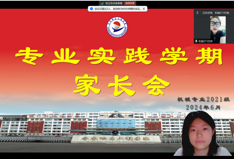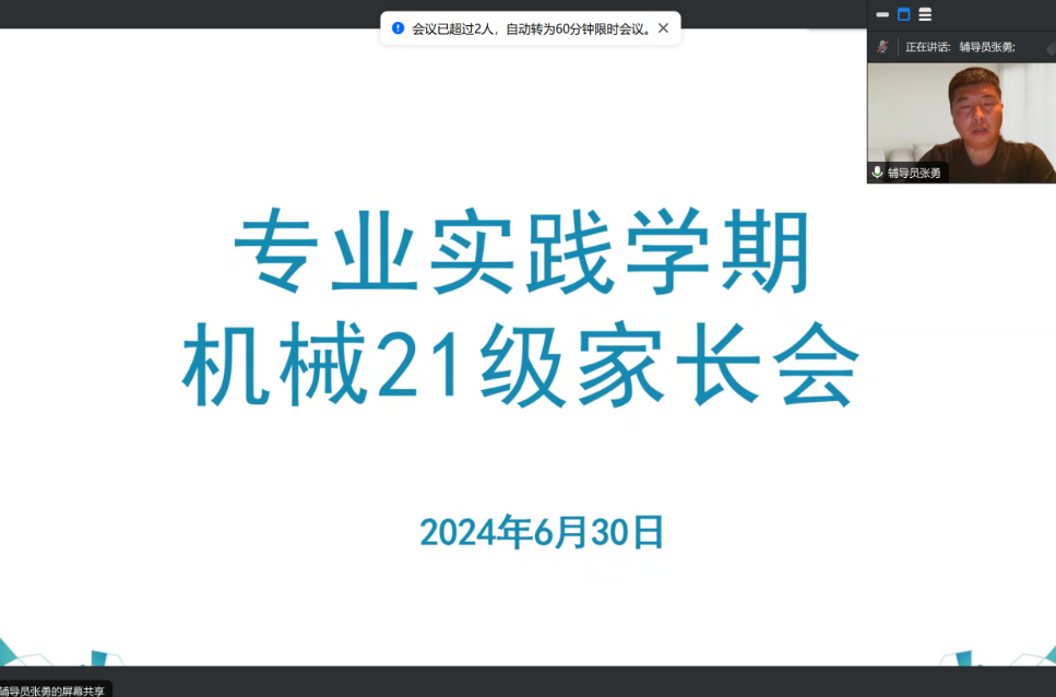 为了和家长一起帮助学生更好地适应专业实践学期的实习生活,明确实习目标,提升实习质量。6月30日辅导员张勇老师召开了专业实践学期家长会,此次会议采用线上腾讯会议的形式进行,由机械211班王念主持,机械21级辅导员张勇老师、专业长甄彩霞老师以及机械21级全体家长共同参与。