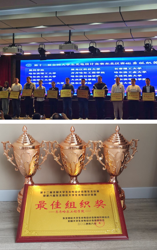 第十二届全国大学生光电设计竞赛东北区赛暨第八届东北地区大学生光电设计竞赛于6月10日至13日在黑河学院举行,东北区赛吸引了来自48所高校的1268支队伍参赛,经评审有120支队伍进入决赛路演环节,我校3支队伍入围。机电工程系电气工程及其自动化专业李世佳、朱子彤、韩顺婷的作品《“智农生辉”–农作物监测系统的引领者》荣获创意组一等奖路演铜杯;电气工程及其自动化专业郭靖宇、王传浩、刘明昊的作品《可以识别水果成熟度的智能保鲜箱》荣获初创组一等奖路演铜杯;车辆工程专业杨得青、商博文、高林、王子昂、刘昊澎、梁畅的作品《基于CC3200的无线监视系统的设计》荣获初创组一等奖路演铜杯。除此之外,还获得东北区赛一等奖1项,二等奖11项,学校荣获第十二届全国大学生光电设计竞赛东北区赛“最佳组织奖”。