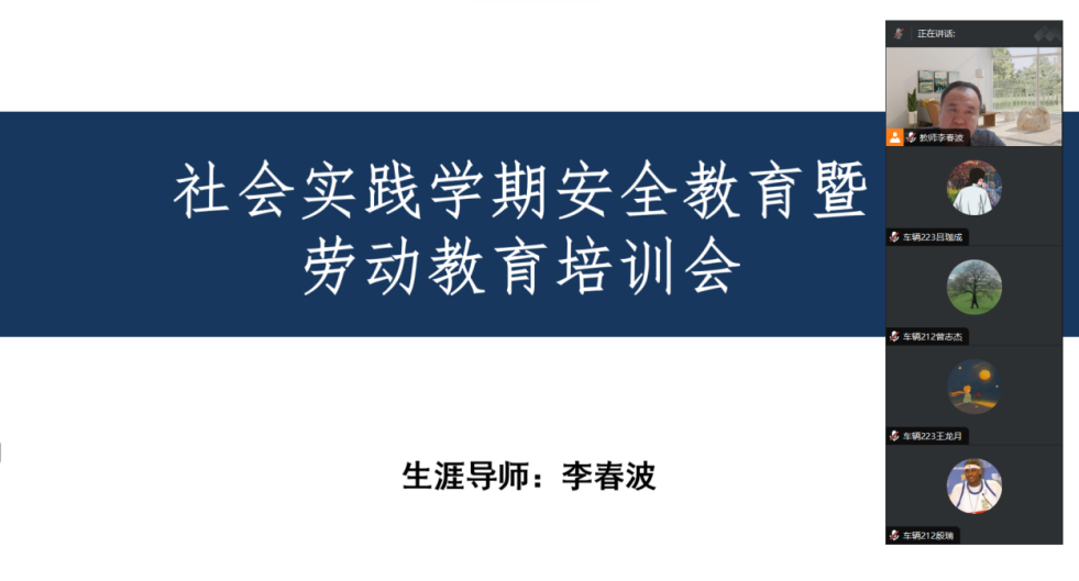 为保证社会实践学期顺利进行,6月12日晚生涯导师李春波组织召开社会实践学期安全教育暨劳动教育培训会,全体生涯学生参会。