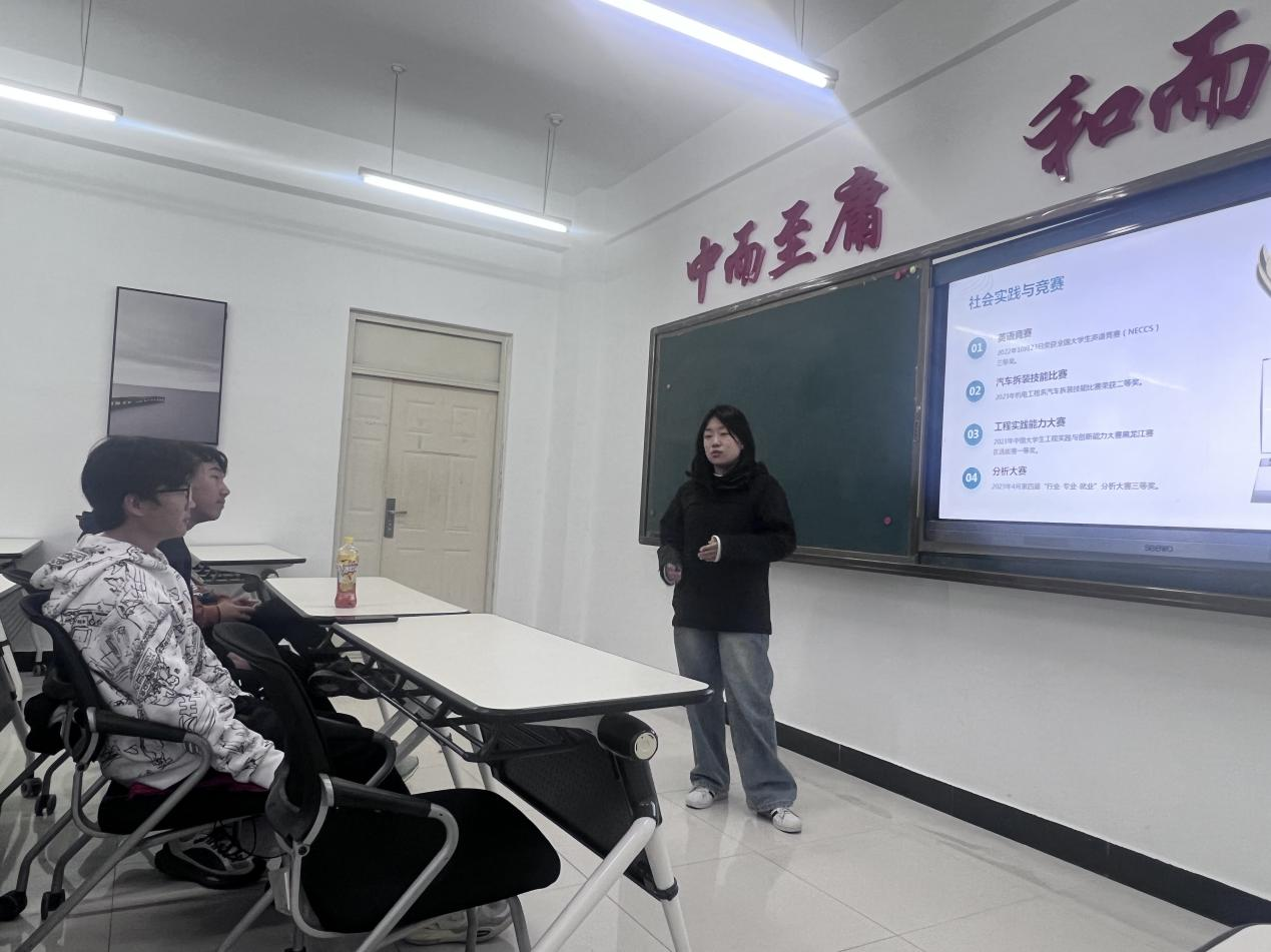 活动当天,邀请了汽服212牟静文学长分享她的学习经验、科研竞赛、实习实践、人际关系。首先,牟静文学长详细介绍了她在“创青春”、挑战杯、中国国际大学生创新竞赛等创新创业大赛中的经历和心得,分享了从项目构思到最终比赛的全过程,强调了团队合作和创新思维的重要性。此次分享不仅激励了在场的同学们,也为他们提供了宝贵的实战经验。随后,分享学习方法、时间管理技巧及教师资格证备考经验。最后,分享了自己大学生活中的点点滴滴,包括如何适应大学生活、处理人际关系、参与社团活动等。