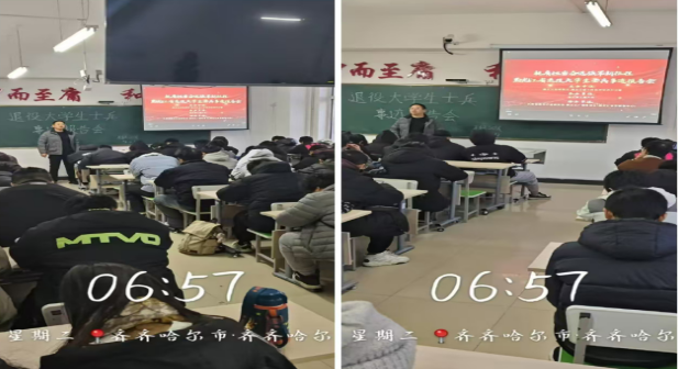 机电工程系车辆23级全体学生早在图书馆110期间齐聚一堂,在图书馆共同观看了《黑龙江省退役大学生士兵事迹报告会》。在事迹报告会中,学生们看见了他们在火热的朱日和训练场上挥洒汗水,在寒冷的边疆上驻守岗位,在孤独的深山里默默守护。