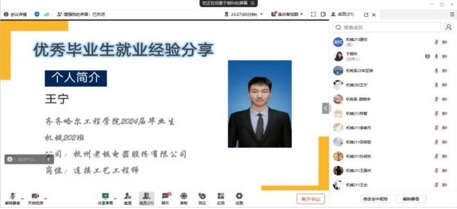 本次邀请到的是机械202班学长王宁,他目前就职于杭州老板电器股份有限公司,顺利通过公司的层层筛选,成功实现了从学生到职场的华丽转型。会上王宁学长毫无保留,分享了求职准备,从简历制作、简历投递的技巧、面试场的应对策略,线上平台及线下途径等多种求职方法,求职攻略和技巧,以及入职后的成长蜕变等,为我们提供了宝贵的就业经验。