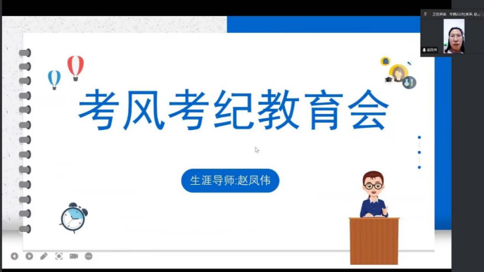 12月19日19点,为进一步加强学风建设,严肃考试纪律,增强学生诚信考试意识,赵凤伟老师通过腾讯会议的方式成功召开了一场考风考纪教育会。此次会议面向31名生涯学生,旨在引导学生认真备考、诚信应考,营造公正有序的考试环境。