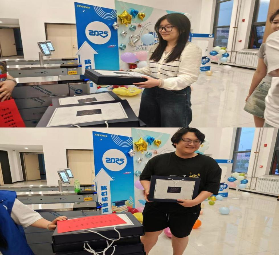 晚会特别设置了令人期待的抽奖环节,二十位幸运的毕业生从众多参与者中脱颖而出。活动圆满结束后,他们满心欢喜地收到了学院精心筹备的获奖礼包。此刻,他们的脸上洋溢着灿烂的笑容,那笑容如同春日暖阳般温暖而明亮。这份意外降临的幸运,宛如一抹绚丽的色彩,为他们的毕业季增添了别样的精彩与回忆。