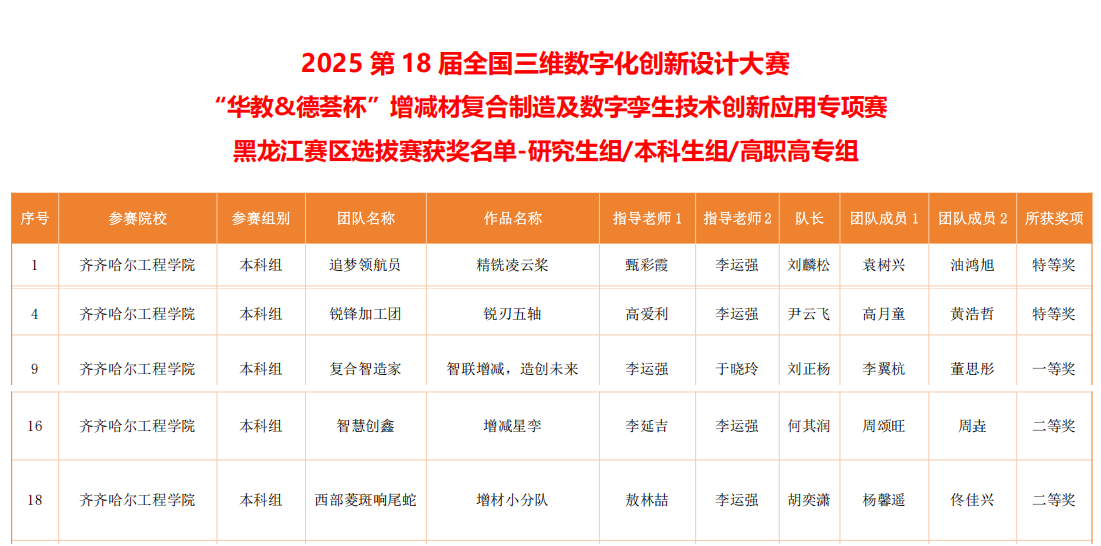 近日,2025年第18届全国三维数字化创新设计大赛“华教&德荟杯”增减材复合制造及数字孪生技术创新应用专项赛黑龙江省赛传来喜讯,我校bevictor1946机械专业的5组参赛队伍中刘麟宋、袁树兴、油鸿旭组和尹云飞、高月童、黄浩哲组获特等奖并进入国赛;刘正杨、李翼杭、董思彤组获一等奖;何其润、周颂旺、周垚组和胡奕潇、杨馨遥、佟佳兴组获二等奖,参赛队伍全员获奖。